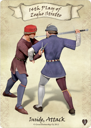 We have amazing art that shows you exactly how your attempts at slicing up your friends are playing out. As a student of the longsword, you can use the card art to familiarize yourself with the positions - everything is accurate, from footwork and blade positioning to hairstyles and hats!